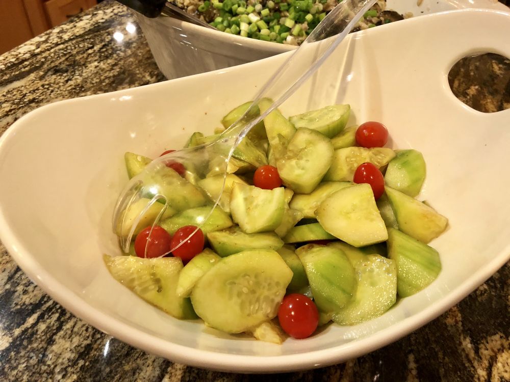 后来发现一个青菜实在不够,我赶紧削了两根黄瓜,加上后院的小番茄,做凉拌酸辣黄瓜。