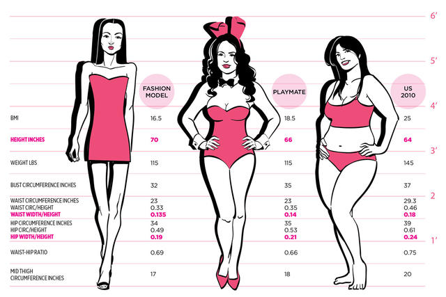 时模平均身高178公分,体重52公斤,BMI只有16.5,比常闹饥荒的孟加拉国女人还低。其实时模的腰比兔女郎粗,不过臀围却远小于兔女郎。