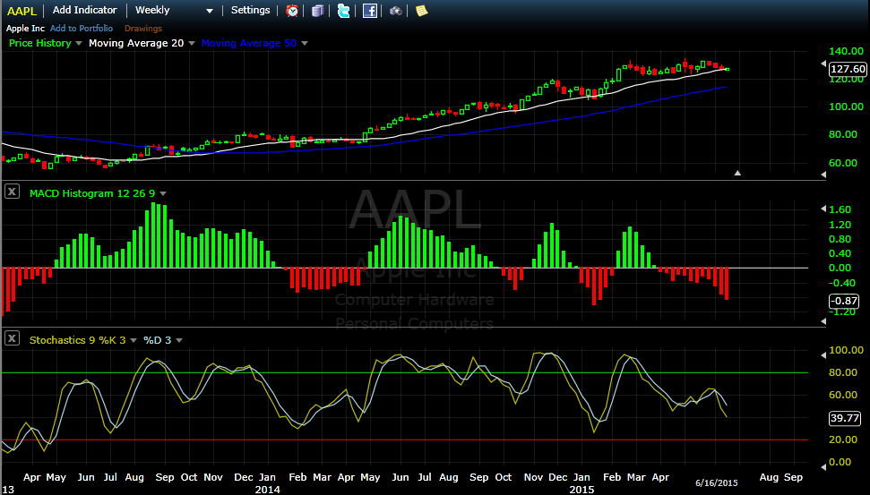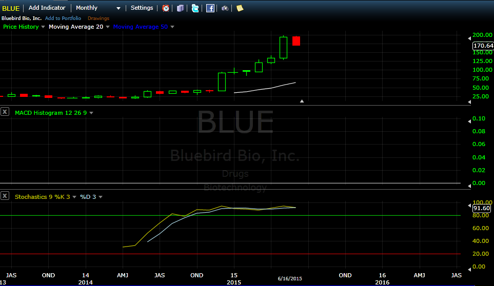 一个指标指KD,可以看出罗威对KD的用法得心应手,他对KD的喜欢大有:这一生只牵你的手, 因为今生有你早已足够的感觉。  他的书基于他的操作对KD有很多自己注解, 金叉,死叉, 20买,50看, 80卖这里就不说了。两点比较有思考性: 钝化和长周期KD观察。他的意思是如果是强势股, 应快速拉至KD钝化区, 在钝化区内的金叉死叉可以不管, 直至K指出80。 如果日KD钝化, 可以追溯至周KD或月KD进行比照。依照罗威标准答案死的快的原则, 恶哥挑战罗威,觉的在KD钝化的时候,可以看MACD, 虽然KD,MACD都源于均线, 但由于算法的不同, KD快, MACD慢, 所以KD钝化,可以看MACD, KD为切点,MACD看趋势。如此可以省去罗先生的50页纸。同样下图AAPL 和BLUE 可以看出BLUE的强势和AAPL 的暧昧。如果日周月的KD都显示向上, 那就是应该连马金都上的时候了。