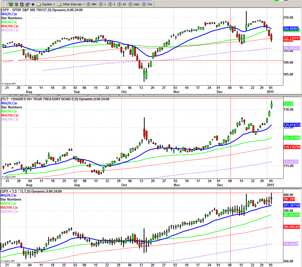 Note the third panel in both chart is simply 1 share of SPY + 1.5 share of TLT, without periodic mechanical rebalancing, which will improve performance further. Also the actual return is higher as both SPY and TLT pay dividends/coupons (around 2% for SPY and 3% for TLT) annually.