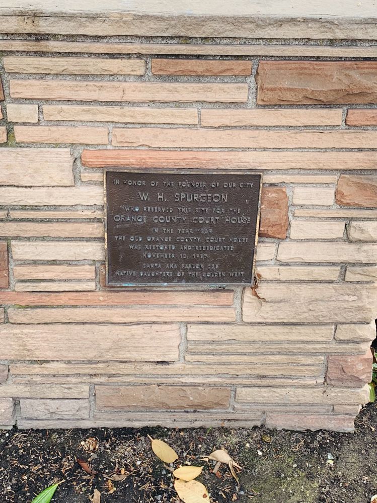 司布真协助橙县建县,也支持把橙县县治设在Santa Ana。1889年,他预留了一块1英亩的地皮来作为橙县法院大楼的所在地;12年后法院大楼落成。这块石碑就是用来纪念威廉.司布真的贡献。