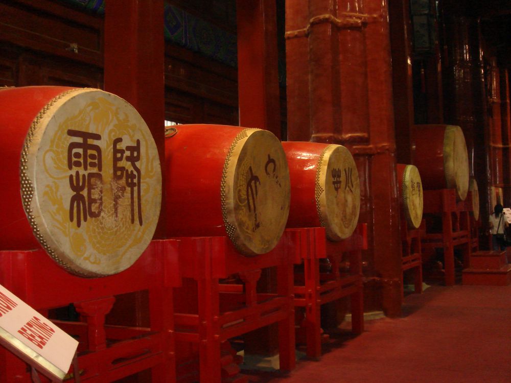 楼内原摆放有25面鼓,其中一面主鼓,24面群鼓,鼓均为整张牛皮蒙制,长2.25米,直径1.34米。