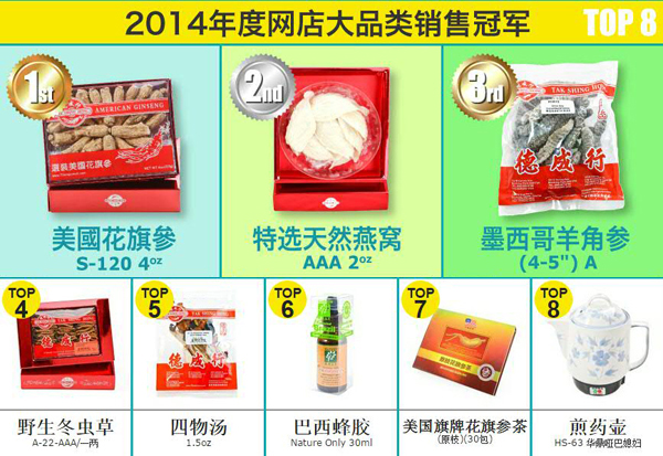 更多详情>>在人们生活水平越来越好的今天,越来越多的人注意到了养生的重要作用,从表中可以看出,德成行的“美国花旗参”无疑是最受消费者亲睐的,这里面除了美国花旗参本身具有极佳的营养价值之外,“老牌子德成行(TSEmporium)是从花旗参起家的”在美国华人心中也是根深蒂固啊。