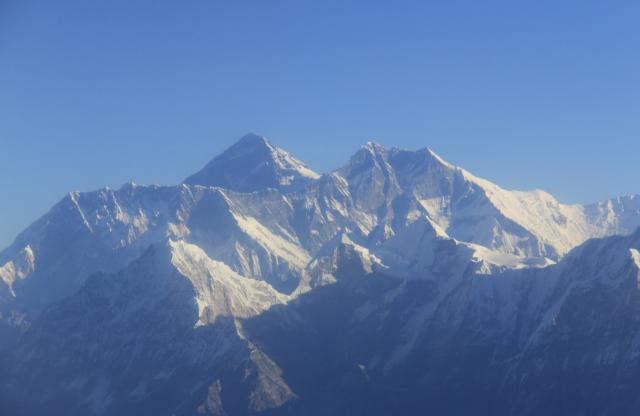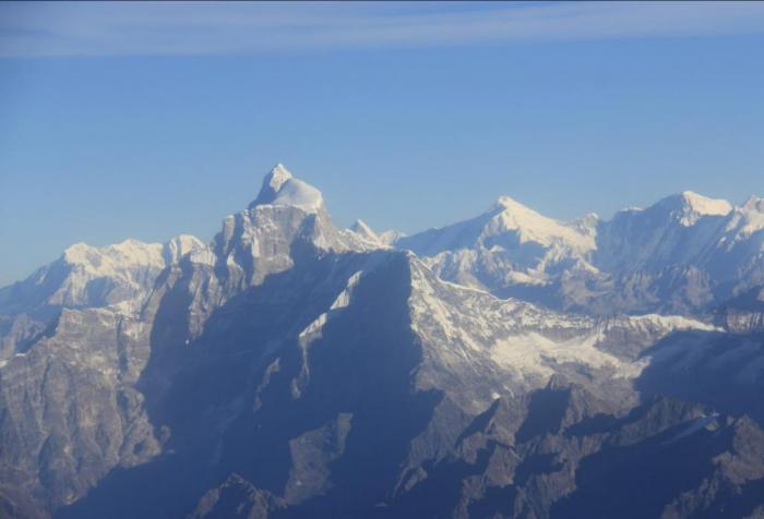飞机起飞了。从空中看加德满都,薄雾茫茫。很快飞机便接近了喜马拉雅山脉。神奇的山峰象一幅画卷慢慢地展现在眼前,我好像在欣赏王希孟(1096年—1119年,中国宋代著名画家)的《千里江山图》。上飞机之前,每人拿到一张山峰示意图,客人可以对照眼见与绘图得知山峰的名称和高度。这里的高峰太多了,我只知道两三个。每当一座名峰出现,广播里便会告知大家它的名字。乘客都趴到窗户上照相。我竟然看到了乔格茹峰, 它是在中国西藏的一座山峰,位於珠穆朗瑪峰以西40公里,屬於喜馬拉雅山脈的一部分,海拔高度7,181米,据说斯洛文尼亞攀山隊在1992年10月23日首次登上該山峰。它的左侧有一座尖尖的山峰,尼泊尔人叫它高丽散可(Gauri Sankar)。两座山峰都十分漂亮。当飞机接近珠峰时每个乘客都被邀请到驾驶室里拍照珠峰。在驾驶室里看到珠峰,感受很神奇,恍惚如梦。