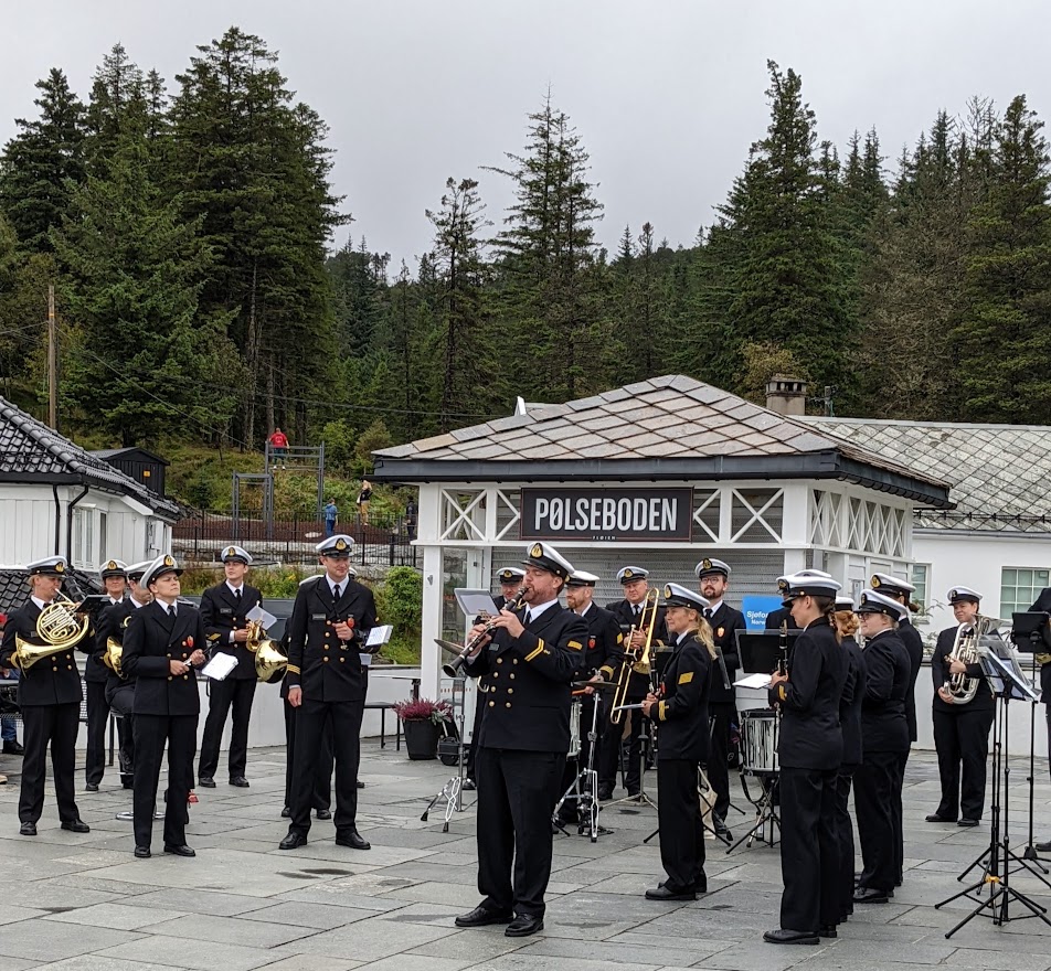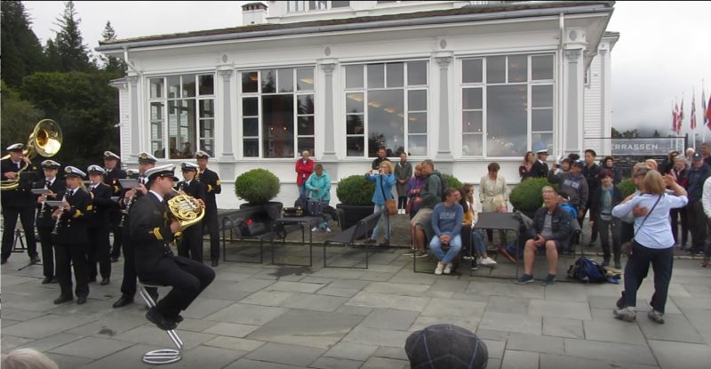 原来缆车的出发点就在布吕根附近,所要登顶的弗洛阴Fløyen山虽然只有400多米高,但是顶部的景色非常,可以一览全城,港湾及周围所谓的卑尔根七座山。其实,如果你细数,不止有七座山,但这也无所谓。奇怪的是一些身着军服手持乐器的人同我们一同乘缆车上山。 刚刚登顶时云层还是相当厚的,没有一丝阳光可以透过。我不禁想起,范仲淹的岳阳楼记中的一句。“若夫阴雨霏霏,连月不开。” 如此就坏了,千万不能这样,神灵一定要给我一道阳光。远望天边的云层已被阳光穿破,从云行方向和速度判断,大概半小时后,这里将有部分晴天。正在拿著相机四处寻景,纠结著何时可以看到阳光时,背后突然传来乐队演奏的声音。原来刚才那些身着军装的人,是挪威海军军乐队队员。不知道为什么他们要在这里免费演奏,他们演奏了多个挪威乐曲。我们看了一场精彩的表演。期间一对老夫妇兴致突起,翩翩起舞。我这才想起格里戈先生所说的惊喜,他的学生们的确实给了我一个惊喜。