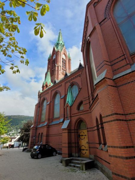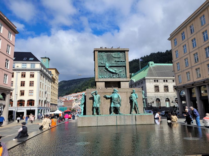 之后,我们又在城市中心,特别是托加曼尼根(Torgalmenningen)广场徜徉了一阵。这一带是林荫大道,两侧的建筑风格协调,整齐划一,排列井然有序。这里百货公司、高级旅馆、服装精品店与餐厅林立;尤其两家最大的百货公司:Galleriet Shopping Mall 和SUNDT motehus都位于此。广场的中央有个知名的水手纪念碑(Sjøfartsmonumentet),用以纪念数百年来活跃于北海的挪威水手。而后我们又去了高处的圣约翰教堂,不巧我们达到时,它不开放。