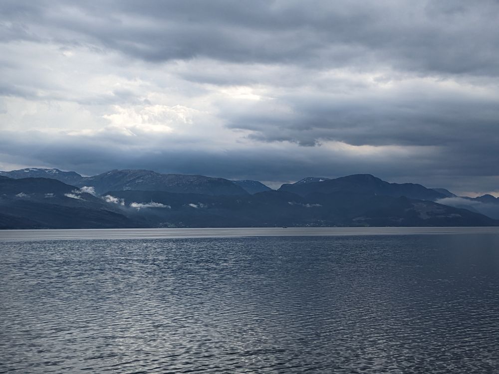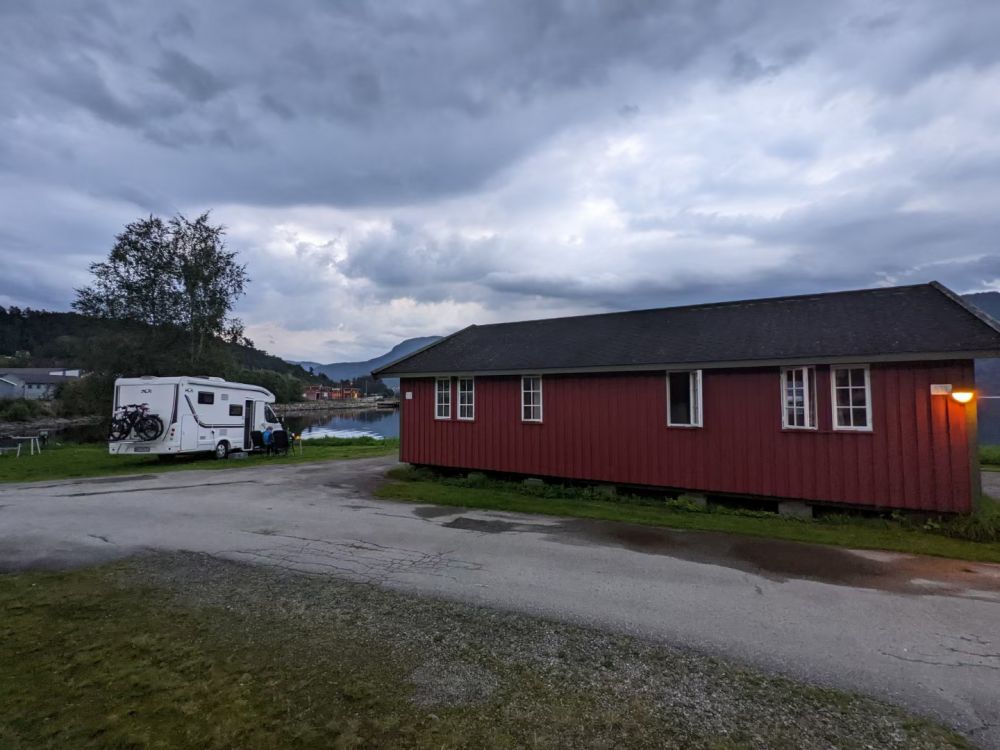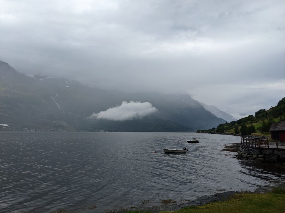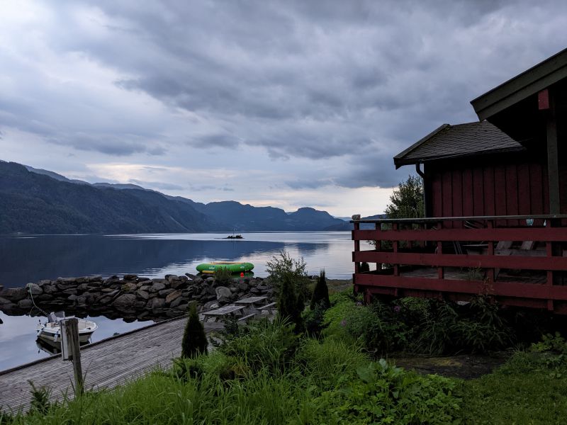 落日时分我们到达了Sauda,一个非常安静的小镇,安静得没有声息。我们下榻之处是在水边的宿营小木屋Sauda Fjord Camping。但见峡湾中波澜不惊,对岸的山峰默默伫立,天空的云朵懒懒地歇息,似乎不肯行走。细看远处山间还有一道淡淡的白线,那是一个瀑布从山上流下,像是某种暗示。我在镇上开车转了一圈,也没有找到开张的餐馆,实在也不想去更远处吃晚饭,因为一天布道石下来我们已经十分疲惫了。回到小木屋内,煮方便面好了,好在屋里锅碗瓢盆一切齐备,我们昨天还在斯塔万格Stavanger买了些鸡蛋和青菜,基本食材也有,吃饭睡觉不表。