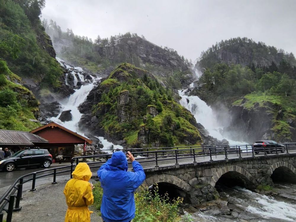 我们驱车继续向北,下一个景点是双子瀑布,它在快进入Odda小镇之前。这个瀑布的特点是它有两只水量相差不多的分流从山顶奔流而下,汇入下面的湖中Lotevatnet。 这个瀑布的高度有165米,由于独特的构造, 它在此地区成为热门景点。现在雨下得稍微大一些,雾气弥空,但是我感觉这个地方来对了,一个左右逢源的地方诗人必能得慧受惠。