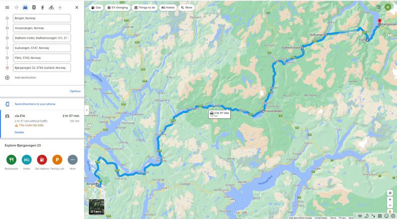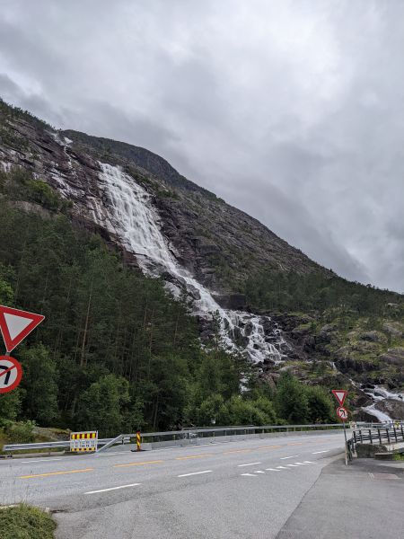 今天对我这个开车人来讲是相当大的挑战,要340多公里去Bergen,仅开车就需要大概六小时。如果再加上停下来观景的时间恐怕会有10个小时左右。沿途一个地区有三段非常著名的观景公路,两段是哈丹格尔峡湾(Hardangerfjord)南北两侧的550公路(南侧)和7号公路(北侧), 一段是索尔峡湾Sørfjorden 东侧的13号公路。而索尔峡湾是哈丹格尔峡湾最长的一个分支。游记第二篇中我们提到了哈丹格尔峡湾在挪威峡湾中的地位,它被尊为王后,7号公路的景区部分是从Granvin到Steinsdaisfossen,550号公路的景区部分是从Jondal到Utne,这里段割舍了,因为我们走同一峡湾北侧。13号公路的景区部分是从Latefoss到Kinsarvik。如果在这个地区停留两天,这三段观景公路便可以都去,彼此间还可以用轮渡连接,如此也是一个不错的选择。还要去一个著名的瀑布Langfossen,它是在Etne小镇的附近。从Sauda到那里直线距离不远,但是隔着高山无路穿过,只好绕行,反向先南走,经520公路,转46公路先西后北,再上E134公路东进。由于今天开车过长,在做计划时,几次犹豫是否放弃此地,然而直觉告诉我,它是不可舍弃的。我自诩为火山瀑布派诗人,这样独特、老长老长的瀑布,岂能错过。