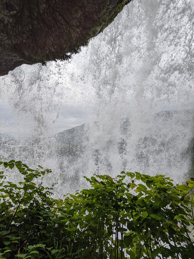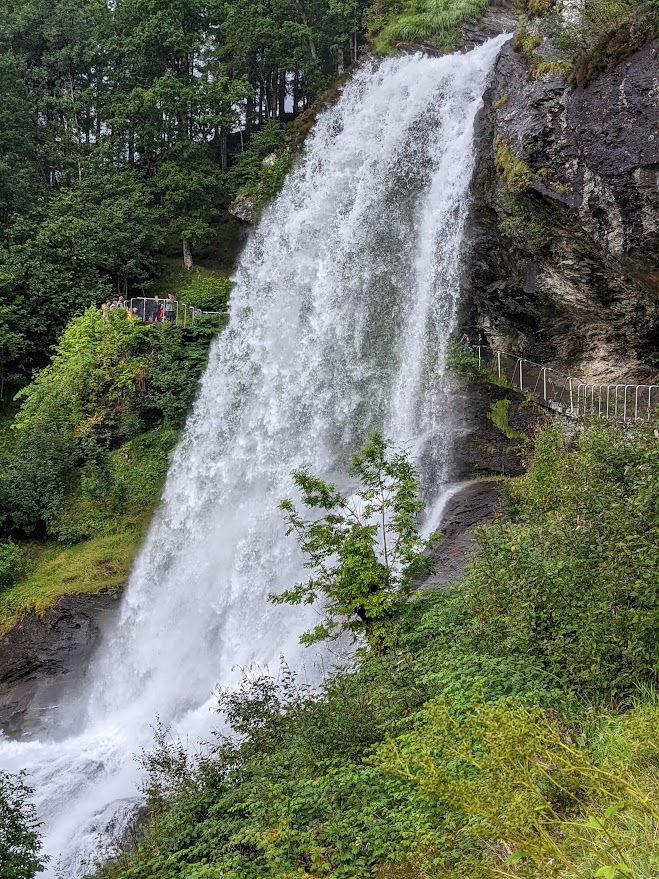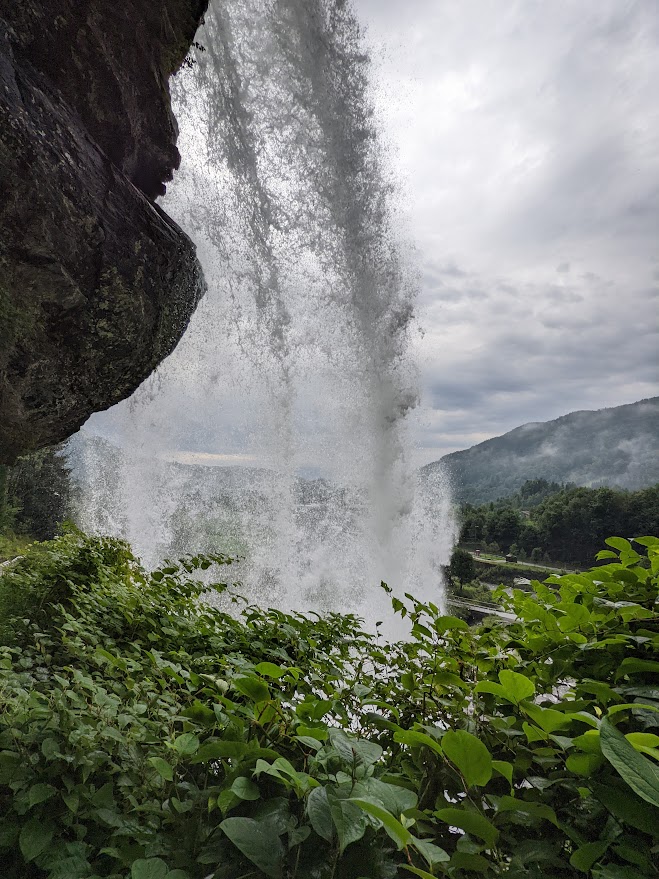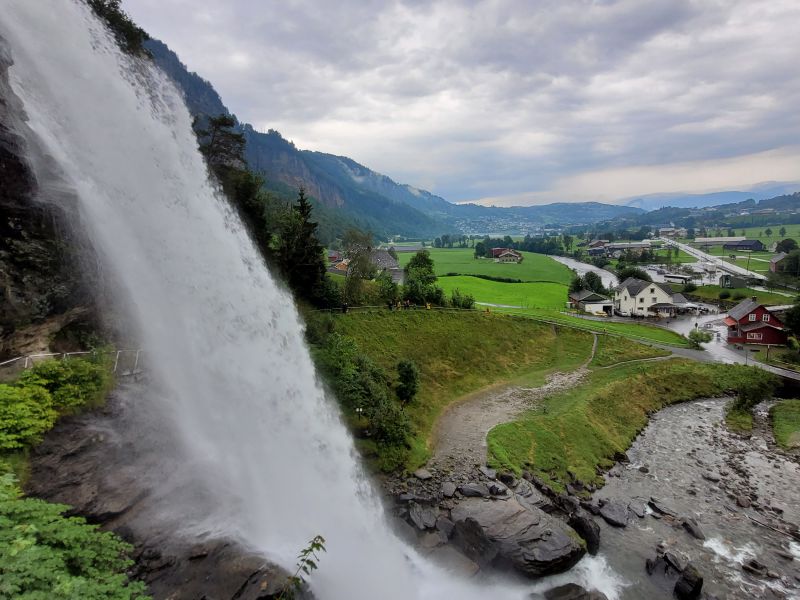 现在雨已经停了,天气还是阴沉沉的。引人注目的是远近山腰上不时会有一缕缕白云飘过。红房,青草,白云,和墨绿色的峡湾构成了一幅无尽的画卷,非常养眼。到了Granvin镇后,我们转上Fv7号公路向西行进。此时哈丹格尔峡湾我们的左手边,行车似乎是在继续展开画卷。在一个风景区的休息处Steinstoberget,我们停下来休息,拍了一些照片,而后继续前进,来到了一个别致的瀑布Steinsdalsfossen。它有些像花果山水帘洞的水帘瀑布。虽然不高,只有46米,可它从一块凸出的岩石上流下,其下方空虚,人可以走过。水泥台阶,栏杆,观景台都已经修好,这是一个相当不错而且非常热门的景点。接近瀑布时,水雾吹到了脸上,我感到非常的惬意,我的笔名捷润中的润字就是对水情有独钟。