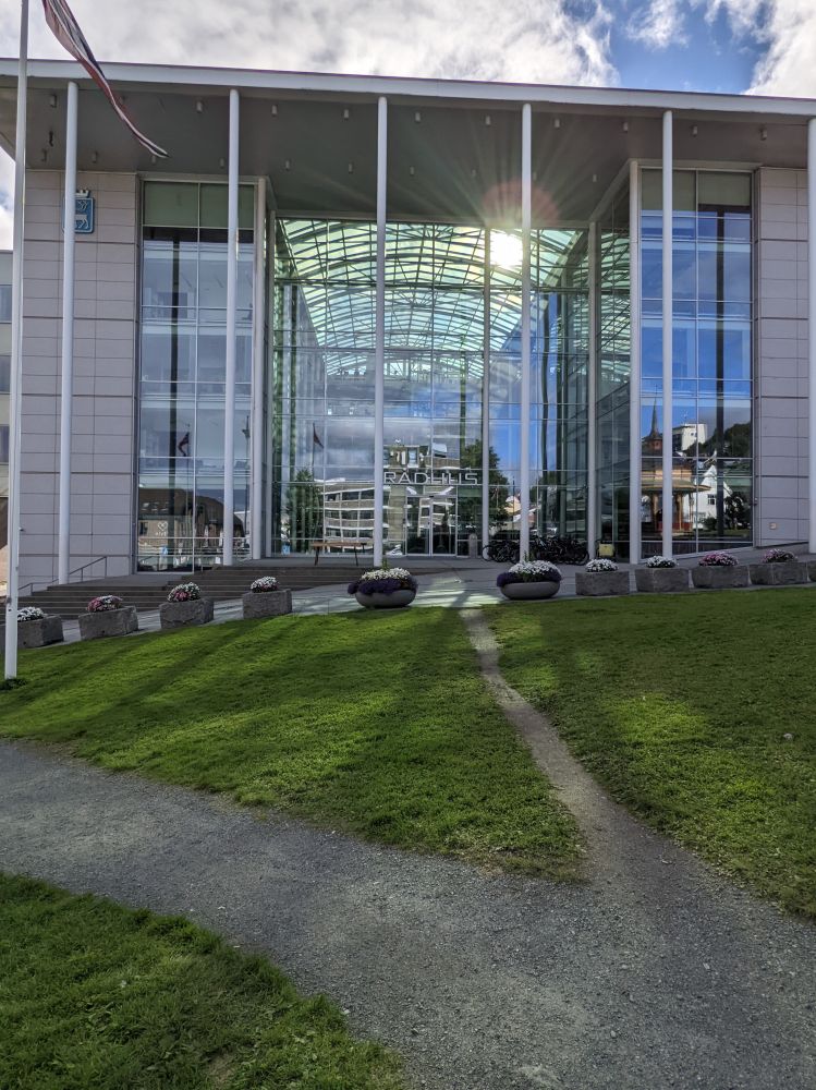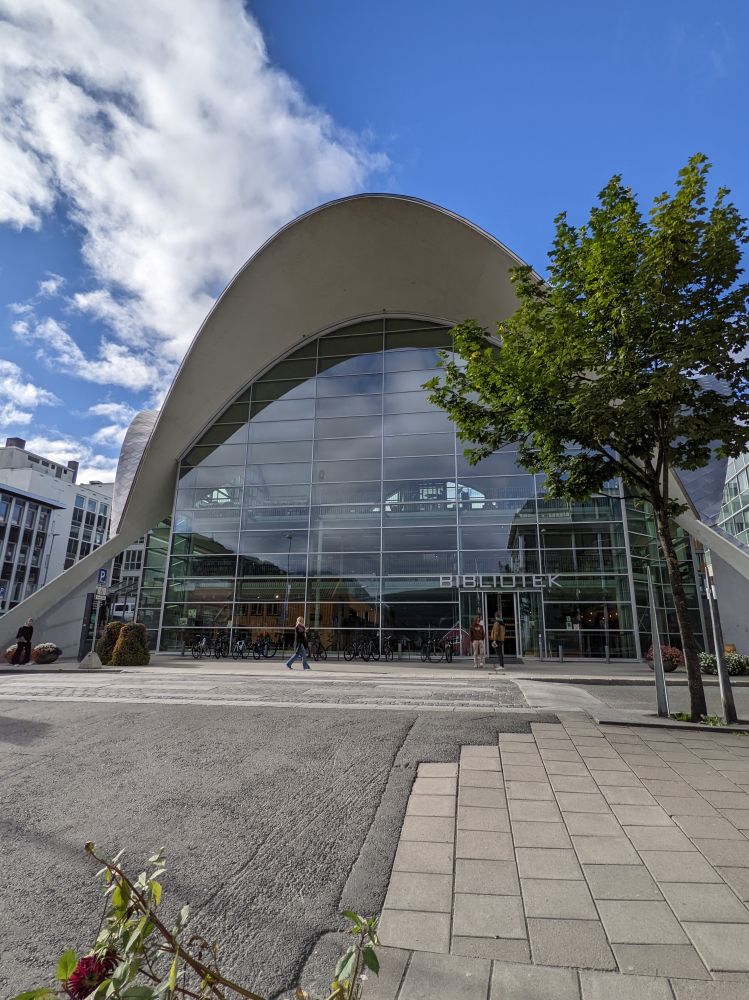 首先我们去了市中心,参观了图书馆,这是一个造型奇特的建筑。据说挪威人非常喜欢阅读,不仅读英文书籍,而且喜欢读他们本国作家的作品,阅读文学作品是挪威文化重要的组成部分。 一个不到8万人的城市,竟然能有这样规模的图书馆,实在值得称赞。