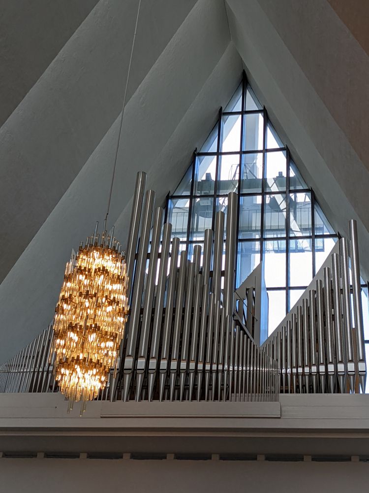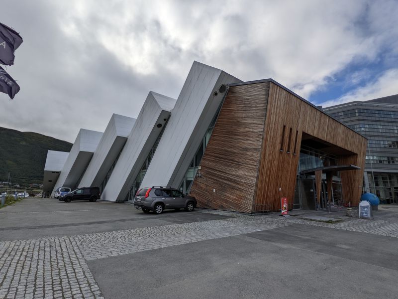 之后我们去了特罗姆瑟大桥,过了桥便是北极大教堂,据说是最北的教堂。它位于一个小高坡上,是一个三角形的白色建筑,于1965年建成,主要是钢筋水泥结构,内部装潢非常简洁。入内参观是要收费的,大概成人票五六美元左右。挪威有很多不规则形状的建筑,看来挪威人是富有。奇形怪状的建筑成本一定要比四四方方的贵很多,但是往往会给人一种耳目一新感觉。