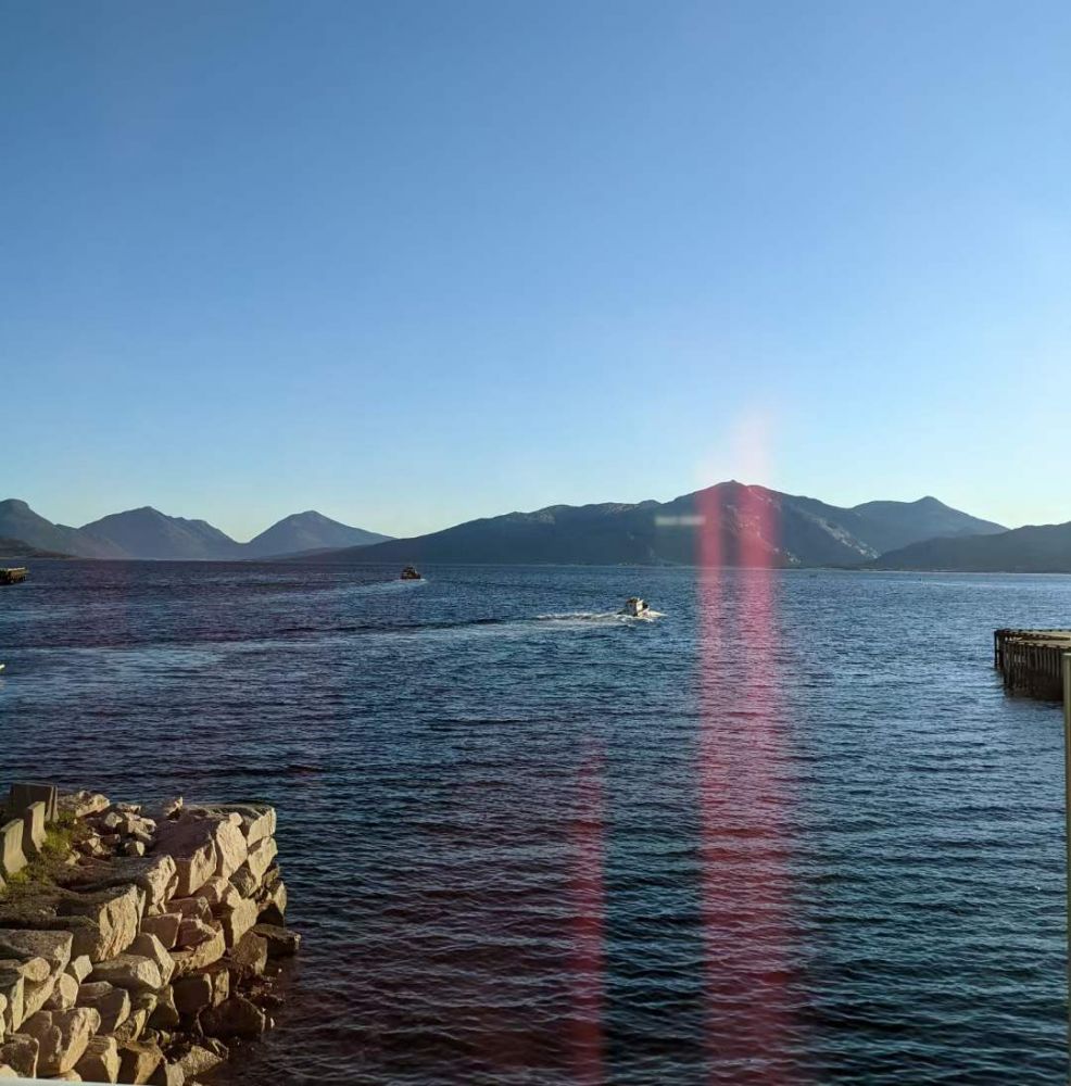 清晨我在海湾边霞光中醒来,从小木屋出来迎接即将升起的太阳。四处溜溜,满眼风光,我感叹大自然赋予罗弗敦群岛得天独厚美色。远远的望到哈姆馁伊桥上那几个意大利青年还在站立拍摄。后来我从他们脸书上得知,昨晚两点左右他们在桥上看到了极光,而我们由于了没有查看极光预告,错过了这次机会。这是我此次挪威猎诗之旅中错失的最大良机,一首美丽的诗漏网了,遗憾啊!其实夏末秋初不太容易看到极光。