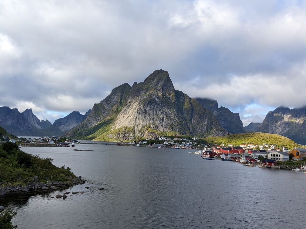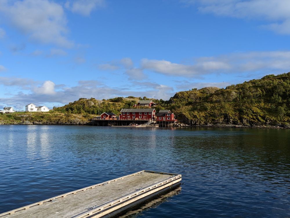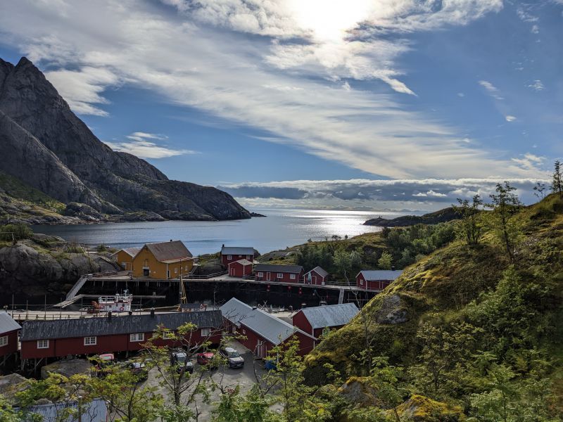 渡轮在2点多一点抵达莫斯克內斯港口,我们下船后直接驶向A0小村,这是串连罗弗敦诸岛的E10号公路之最西南端。小村过去只是一个纯粹的渔村,随着旅游者不断增加,这里也开始变得商业化。附近有一个不高的小山,爬到山顶可以俯瞰村子及周围海域的景观,非常值得攀登。