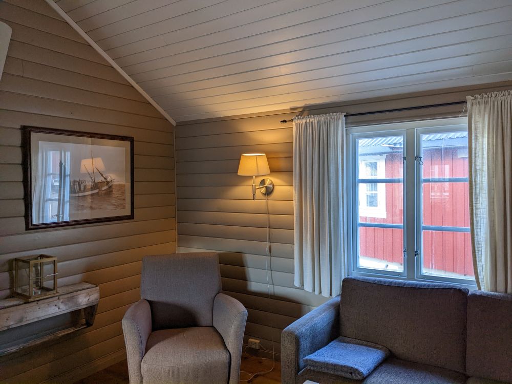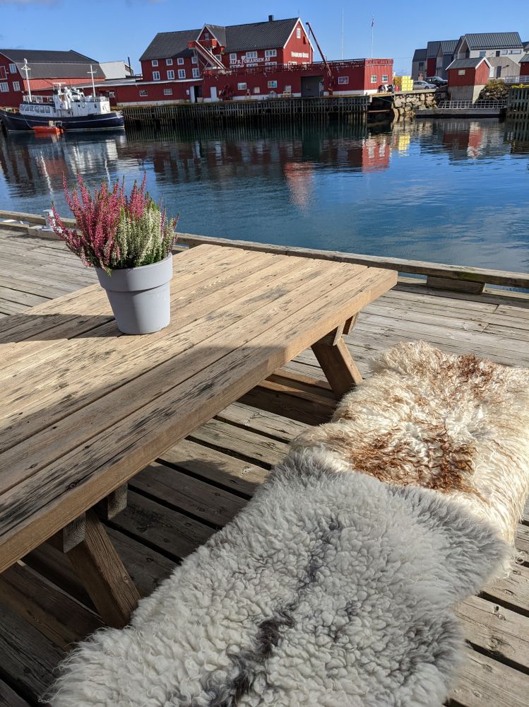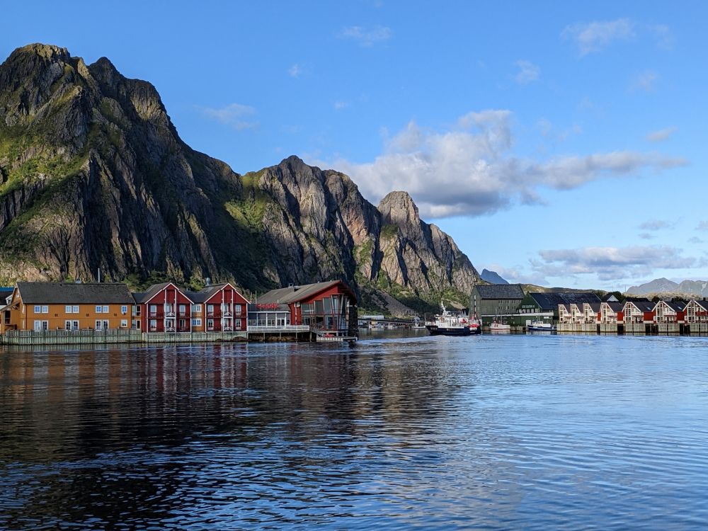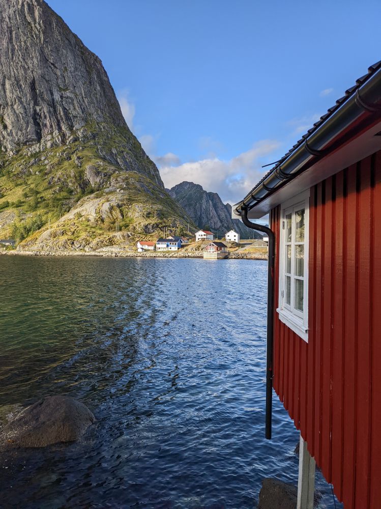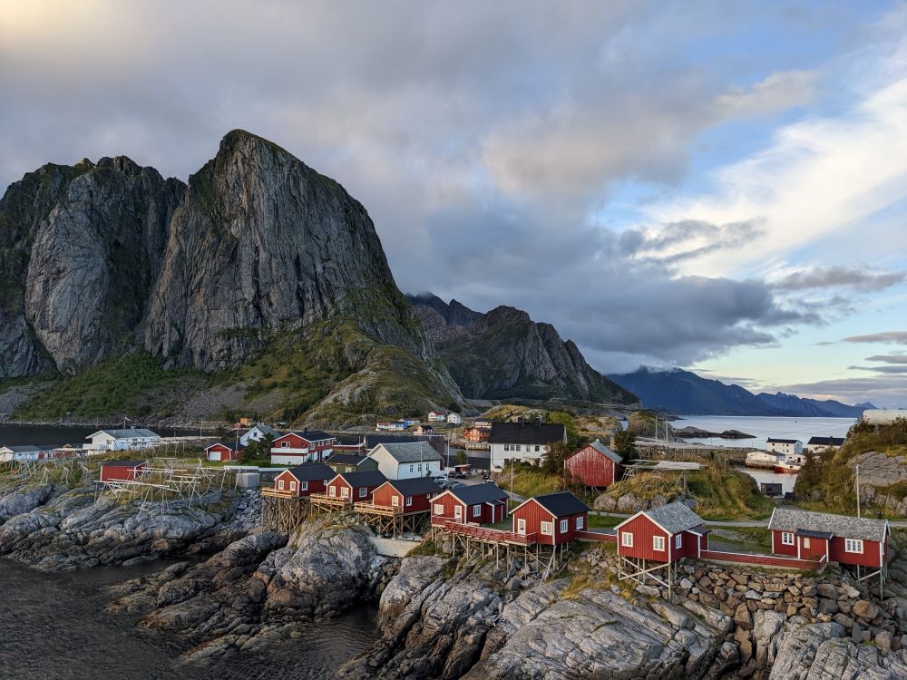 我们的住宿地方在哈姆馁伊Eliassen Rorbuer。此度假村里全是一色的深红小木屋,我们所下榻的那间隔水正对着如一块巨石般耸立的山峰。那正是人们经常在明信片或杂志上看到的那座山峰,其前面是海湾和红色的小木屋,在这里我真有身处明信片之中的感觉。