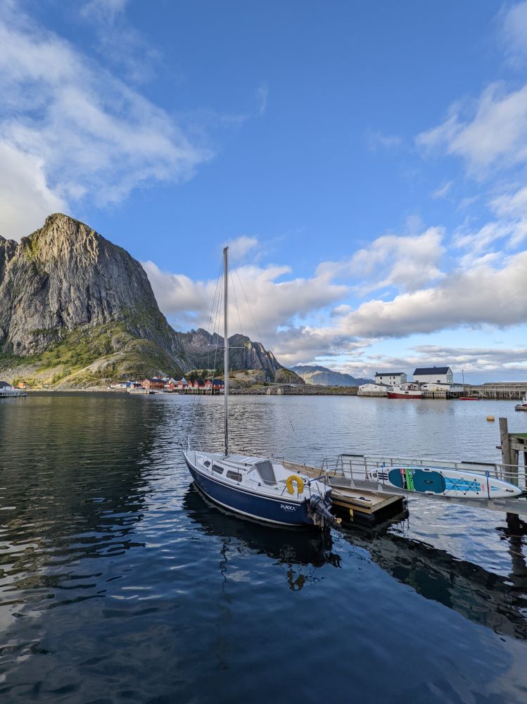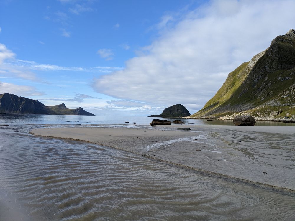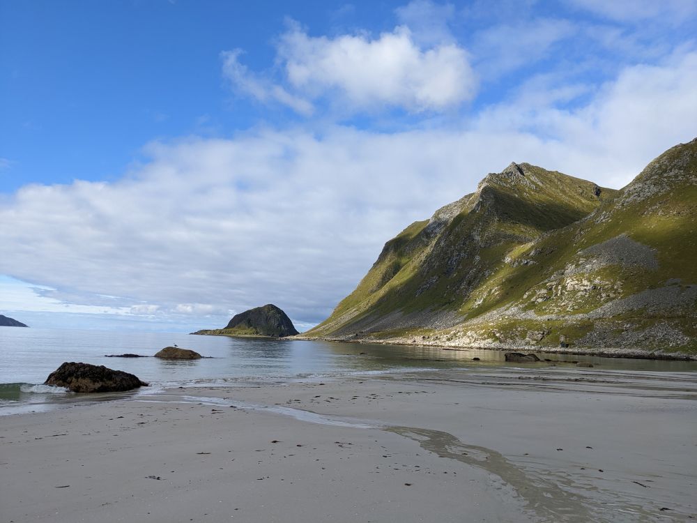 之后我们又去了努斯菲约德渔村,进村参观还需要买门票,就在周边转了转,因为没有什么特殊的景点,而罗弗敦岛上景色处处皆是,更不乏渔村。随后我们去了莱克内斯,从那里又去了一个非常美丽的沙滩—豪克兰沙滩。此沙滩上可见群山180度环抱海湾。海水碧蓝轻荡,长天云行无声,山峰静默伫立,海滩上只有我们带笑声的身影。我注意到岸边有不少人在这里宿营,有搭帐篷的,也有住房车的。