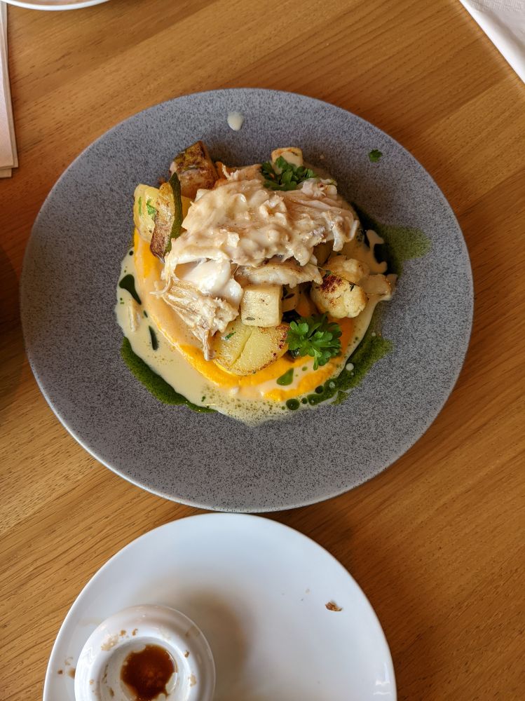 我们在度假村徜徉了一阵便去村中的餐厅用晚餐。点了鳕鱼,青口贝,还有鲸鱼肉,据说鲸鱼肉味道并不鲜美,所以烹饪时佐料特别的重,饭菜水平不错,侍应生是个比利时小伙,之前在比利时的著名的巧克力厂工作过好几年。