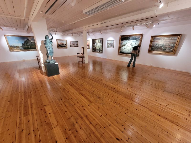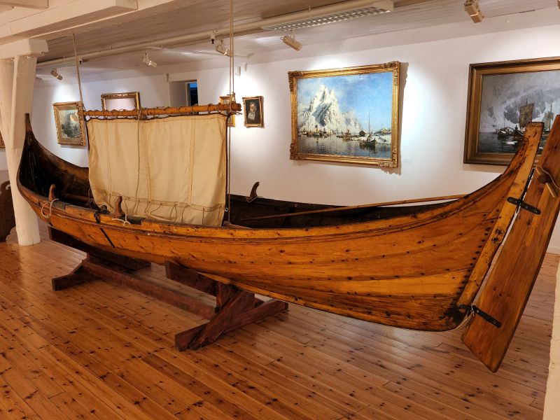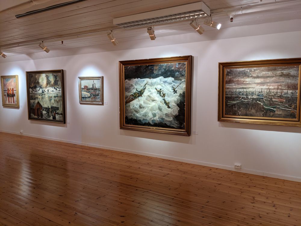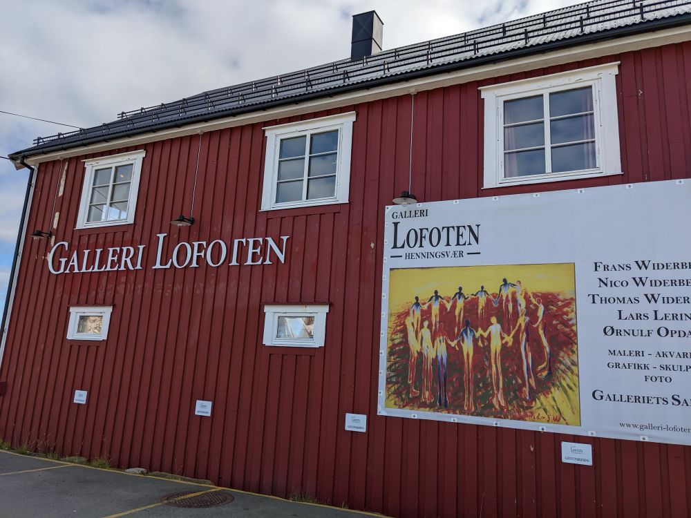 亨宁斯韦尔位于斯沃尔韦尔西南25公里,据说原来是一个渔村,现在看来其规模相当于一个小镇。一条窄窄的海峡,将小镇所属的两个小岛左右分开。由于大多房屋沿水而建,故有“罗弗敦群岛的威尼斯”之美誉。我喜欢看绘画,虽然不懂多少,总是愿意乱找些观感,发表些愚见。我们把车停在罗弗敦画廊Gallery Lofoten门前,这样省去了停车费。画廊里的有些收藏相当不错,特别是那些关于当地美景的绘画。只是对挪威的大多数画家不熟悉,只知道蒙克。后来补作业时得知一个本地土生土长的风景画家Gunnar Berg (painter),画了相当多群岛上的风景,他的作品也在此展示。