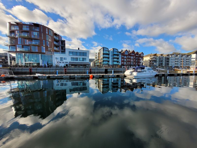 斯沃尔韦尔是罗弗敦岛上最大的一个城镇,原来只是一个小渔村,1800年才被允许游客在此留宿,后来这里慢慢变成一个交易的城镇。1996年挪威政府将它设定为一个城市,它的名字挪威语的意思是“寒冷的渔村”。这是一个非常漂亮的小城市,山峰奇特秀丽,海水碧蓝清澈。我们到达时天气极好,天晴而有云,拿起相机随便一照便是一张明信片。当然在罗弗敦群岛,许多地方都是如此,不足为奇。在码头转悠了一会儿,找到一家叫“你好”的中餐馆就餐,这家很正宗,老板是香港人,老板娘是成都人,饭菜相当不错。饭后我们又在城市里转了一阵,随后去参观了斯沃尔韦尔教堂,它的边上有一个公园,里面有一个雕塑叫做“北方之眼”,其形状像是一枚蓝色的宝石,中间有一个孔,人可以爬上孔内照相,效果挺有意思。