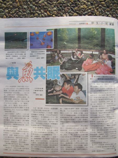 这家水族馆我已经来过5,6次了,每次都在周末,次次人潮滚滚。现在每个展厅几乎没人,我带着两个儿子在海獭厅里看了好一阵。海獭们一会跑上岸,一会跳下水,跑跑跳跳,追逐戏闹,毫无片刻歇息。而且其速度极快,有些动作逗人发笑。在海藻丛林厅,巨大的水池里许多鱼已经不在游动,停在原地休息,原来鱼就是这样地睡觉的啊。在岩石海滩厅(ROCKY SHORE) 诸多的海葵象奇异的花朵给我留下了深刻的印象,大概是身边无人拥挤,赏花更能专心吧。今天我竟然能在水母展厅里独自一人呆了好一阵无人打扰。看着伞状水母姗姗地游动,平日紧张的神经顿时松弛下来。这样独享宁静与优美,我感到非常满足,心想:即便象BILL GATES那样有钱的人所能买到的也不过如此罢。 8点钟,所有参加活动的人们在礼堂集合。水族馆的工作人员为大家分配露营位置。有些人被分配到海獭厅,有些人被分配到水母厅。我们453支队人们所“下榻” 的地方正是馆内拥有最大的鱼池的那间展厅-外海湾(OUTER BAY) 。据说厅里那主观赏玻璃窗长56。6英尺,高17英尺,厚13英尺,可谓特大。透过玻璃,人们可以看到多种海洋动物在游弋。其中有海龟,锤头沙鱼,白端沙鱼,巨大的黄翅沙丁鱼,等等,景象非常壮阔,站在它面前大有身临海底其境的感觉。无论大人小孩都有抑制不住的兴奋,人们手忙脚乱地开始铺床。有人只有一条毯子加一个睡袋,有人支起了折叠床,还有人带来了冲气的气垫床。真是八仙过海,各显其能。想想在如此的环境中休眠实在是别有趣味,不可多得。我相信有关海的故事在梦中一定会象水中一串串气泡一样在脑海里浮出。安徒生笔下的小美人鱼向往人世,为追求灵魂而化做浪间泡沫。如今我却厌烦了让钱牵着灵魂走的尘世,来到“海底世界”清静心灵一时。此念一出,我倍感今宵一刻值千金。