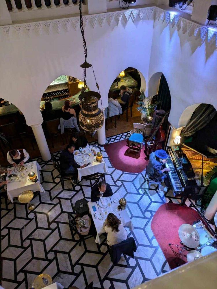 晚饭是在瑞克咖啡馆吃的法式菜肴。三道菜,沙拉,烤鱼,甜点。不敢恭维这里的烹饪水平,比较一般。无奈餐馆名声大,装修和位置都很好。人们太喜欢《卡萨布兰卡》(《北非谍影》)这部电影了,喜欢英格丽·褒曼,以至于爱屋及乌。这里的饭菜不愁没有人吃,想在这里用餐需要提前预订,而且还不容易订到。不过还是比爱丁堡大象咖啡馆(JK罗琳写哈利波特的咖啡馆)的东西好吃一些。可大象咖啡馆有理由做饭难吃,让你体验当年罗琳就是吃着如此难吃的东西写出了红极世界的小说。这是怀旧餐。瑞克咖啡馆没有这样的借口。当然假“山姆”一定会弹奏并演唱《随着时光流逝》(As Time Goes By)这首电影中的主题曲。看过电影的人一定会产生共鸣。此曲一响,我一越而起,冲出包间跑去拍视频。我并不是唯一这样做的客人。