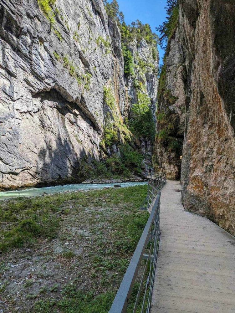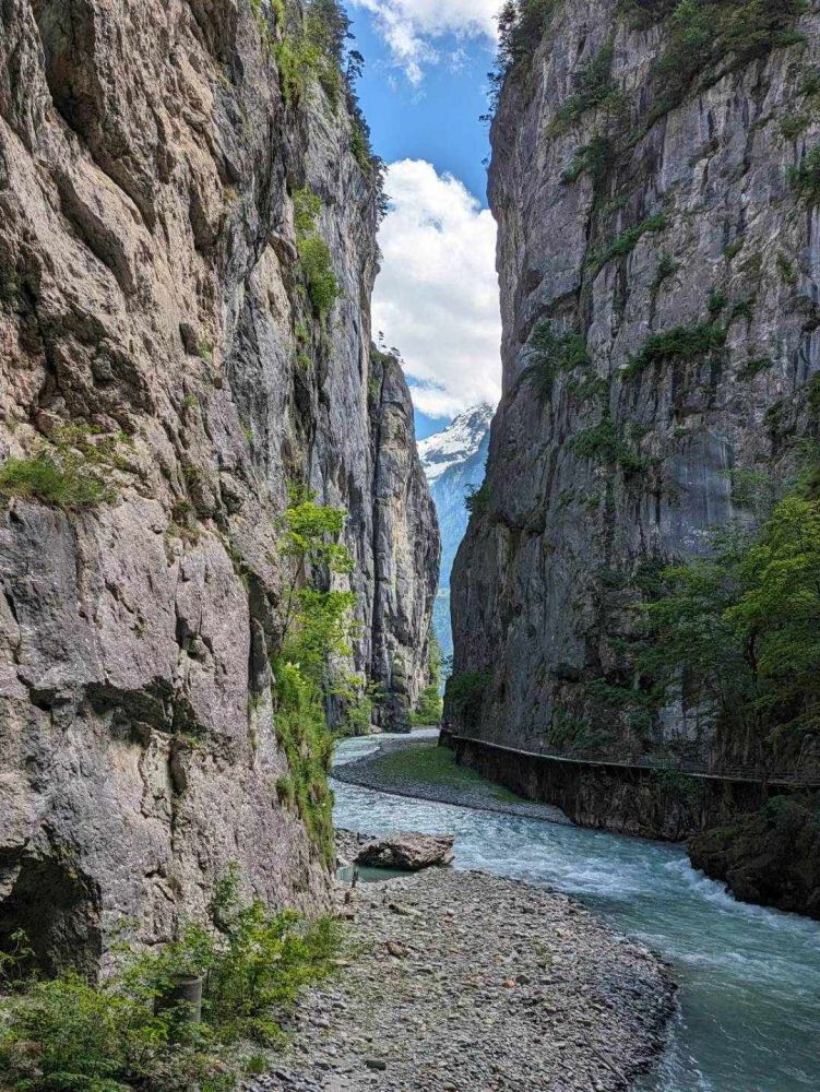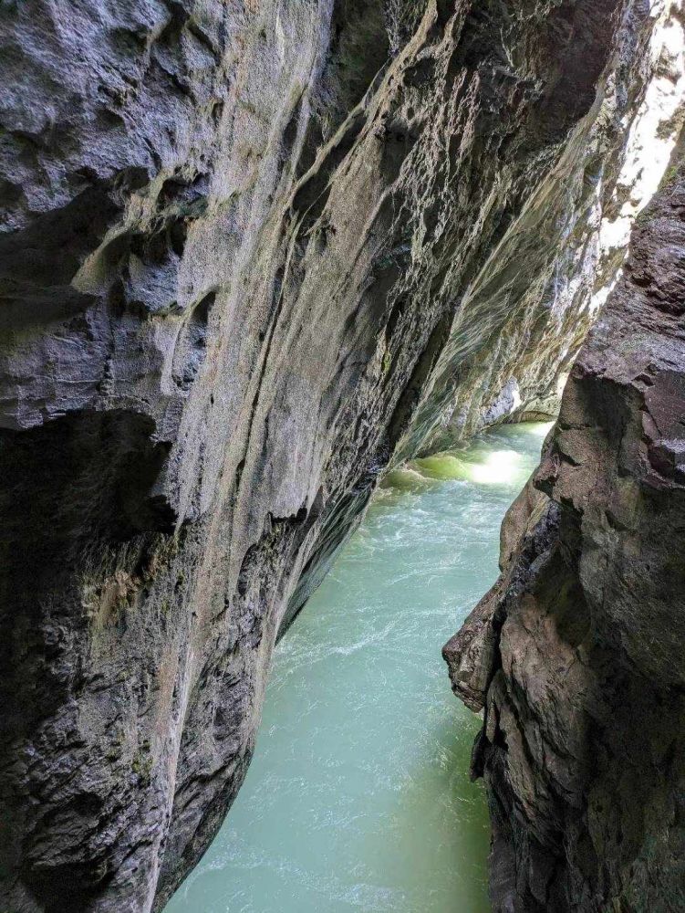 不少去过瑞士旅游的朋友都去过因特拉肯,那是一个风景迷人的小镇,夹在两个湖泊之间,周围的山峰峡谷非常漂亮。其实不少人错失了去阿雷峡谷的机会。阿雷峡谷在因特拉肯东面,距离不到30公里。峡谷由阿雷河(Aare River)切割石灰岩形成,全长约1.4公里,最窄处仅1米,最宽处约30米,石壁高达50米。这一地质奇观是冰川融水经过数千年冲刷而成。游客可通过木制步道和隧道安全穿越峡谷,感受两侧峭壁逼仄、流水奔涌的壮丽景象。峡谷内清澈的阿雷河呈蓝绿色,在阳光照射下分外晶莹。