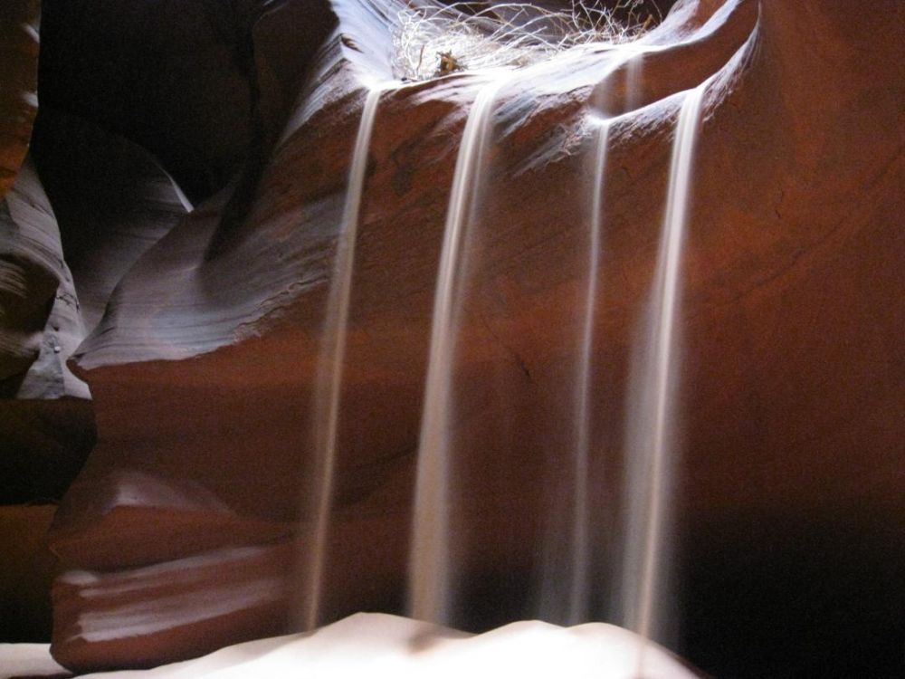 梦幻光影为最大特色。正午阳光直射形成神秘光柱,砂岩随光线变幻橙、红、紫色调,岩壁线条如波浪流动,宛如天然雕刻。多年前我在此拍摄一组照片,其中一张捧沙制造“沙流”的作品《While the Sands of Life Shall Run》获小奖。标题取自苏格兰诗人罗伯特·彭斯著名爱情诗《一朵红红的玫瑰》。