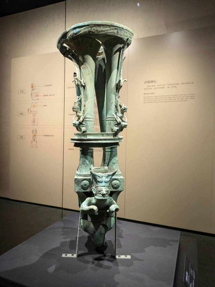 10. 青铜神坛(残件复原)宗教场景:分层结构展现“天地人”三界,有神兽与跪坐人像,或为古蜀祭祀仪式的微缩模型。