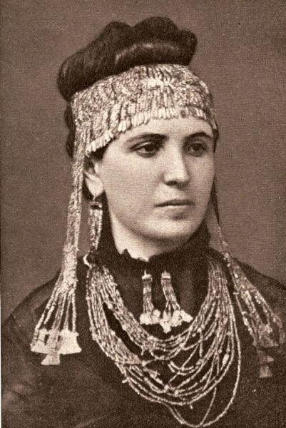 (施里曼的太太佩戴天下第一美人海伦的黄金首饰照相)