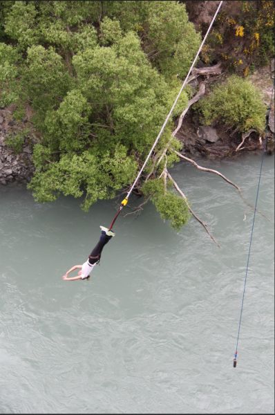 与之不同的是蹦极。卡瓦劳大桥蹦极是世界上第一个商业化的蹦极跳点,被誉为现代蹦极运动的发源地。它位于新西兰南岛著名的冒险之都——皇后镇附近的卡瓦劳河上。这项蹦极跳由新西兰探险家哈克特 A.J. Hackett 于1988年创立,至今仍吸引着世界各地的极限运动爱好者前来挑战。卡瓦劳大桥的跳跃高度为43米,跳跃前挑战者向下看没有那么恐怖。虽然高度比天空跳低得多,但它采用的是最原始、最经典的蹦极跳方式——真正的自由落体加弹性绳反弹。