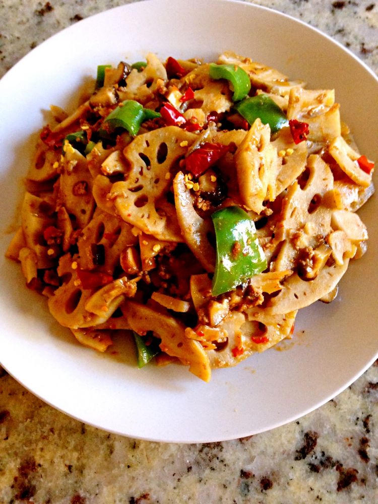 4) 炒至藕片变色,加入白糖、醋少许、生抽、盐、豆瓣酱大火炒匀