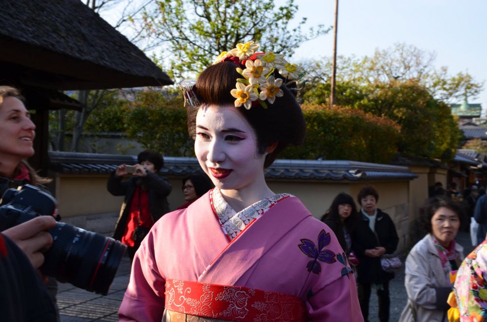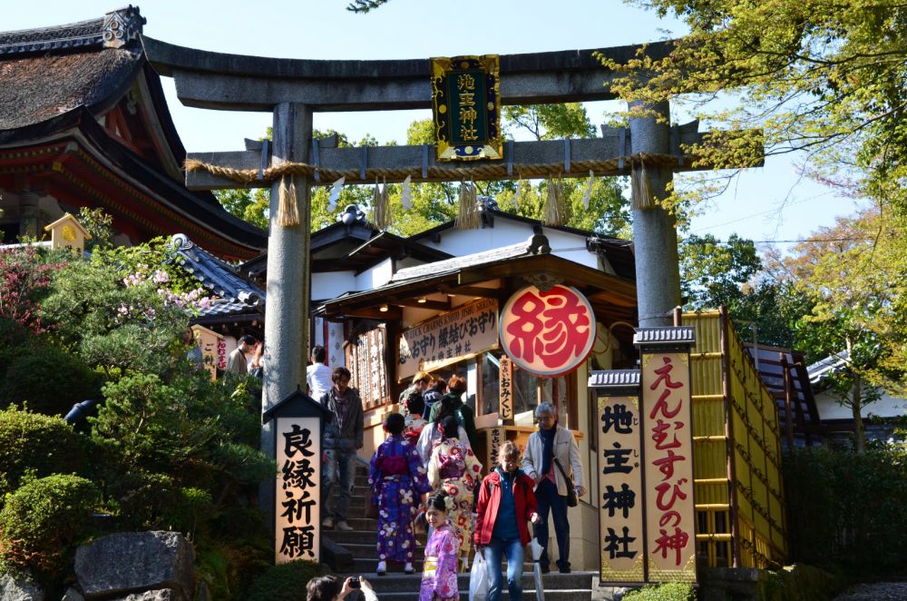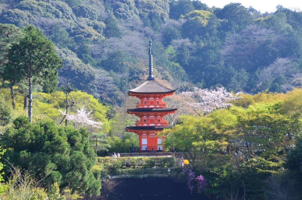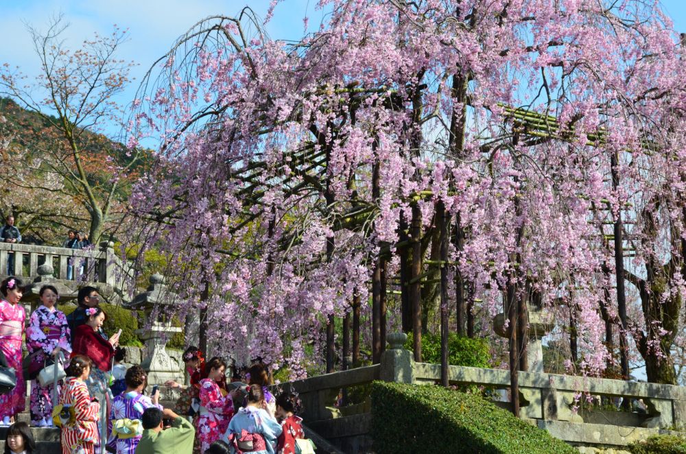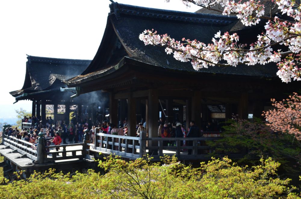 来到清水寺的时候,正是中午。经历了几天的细雨绵绵,阳光明媚的日子让樱花浪漫地怒放着,花儿一样穿着和服的姑娘在樱花树下显得格外妩媚动人。亭台楼寺依山傍水,遥相对望,在日光下述说着古老的传说。
