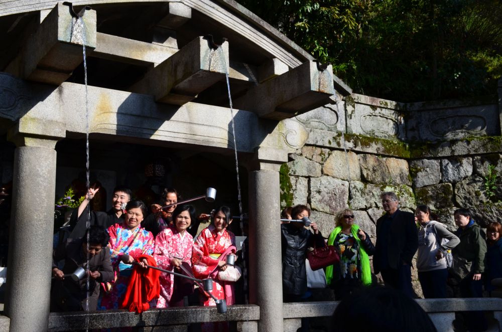 清水寺因寺中清水而得名。顺着奥院的石阶而下便是音羽瀑布, 清泉一分为三, 分别代表长寿,健康,智慧,被视为具有神奇力量. 游客路经此地一定会来喝上一口水, 据说可预防疾病及灾厄。相传延镇上人于778年在此开山后兴建。现存的大部分建筑始建于公元1633年,被定为国宝的主堂是由139根立柱支撑的,宛如硕大的舞台,又称“清水舞台” 。