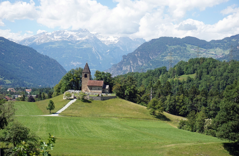 在Tiefencastel下车,等下一班回圣莫里兹St Moritz 的普通车local train。空寂的小站上只有我们两个人。Tiefencastel 藏在大山里,一片宁静,连不远处的教堂都一声不响,只有微风飒飒而过。坐了一刻钟,一种极大的不真实感袭上心头: 我们两个中国人,坐在空无一人的瑞士深山小站,要有多少个偶然才有这一刻的实现!有一刹那,甚至觉得再也不会有车来了,时间在这里是凝固的,我们就永远这么坐下去了。