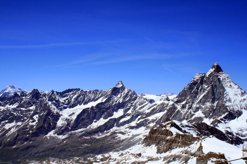 马特宏峰冰川天堂Matterhorn Glacier Paradise 气势宏伟,是看全景的好地方。但如果为了看马特宏峰,因所站之地距离太近以及海拔太高,反而看不出马特宏峰特有的壮观气势,独特的三角锥山体经典造型也不明显。看马特宏峰的气势,还是Gornergrat—Rotenboden 一线为好。