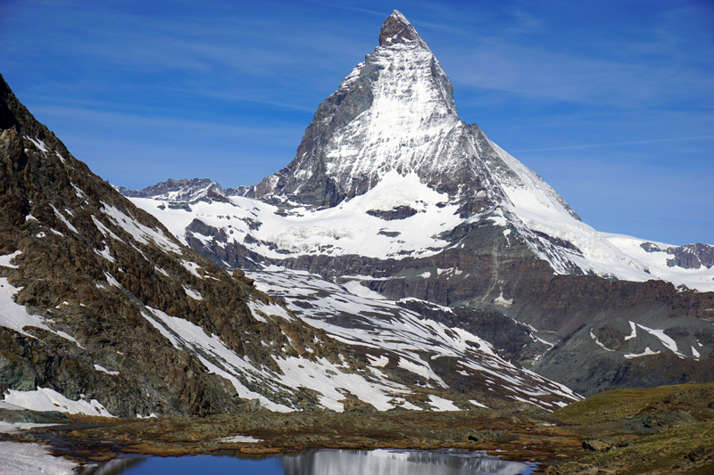 天气晴朗,马特宏峰才会露出真容,可惜它经常被云遮雾盖。 我们好运气,碰个大晴天。 起个绝早,赶第一班齿轮小火车上山,第一个到了马特宏峰最佳观景地---- 倒影湖Riffelsee。
