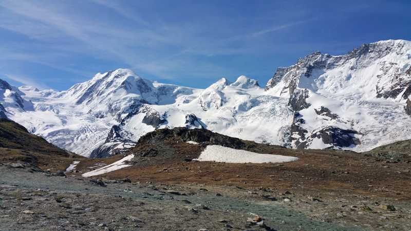 Gornergrat观景台四周雪峰连绵起伏,除闻名遐迩的马特宏峰外,还可以看到著名的Monte Rosa(罗萨峰,海拔4634米)等二十多座海拔4,000米以上的阿尔卑斯山峰,视野极是宏远辽阔, 我们试着照连绵的全景,但效果不好。
