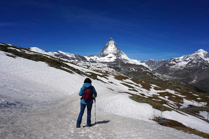 回程走倒影湖步道,如时间充裕,可一直走回Zermatt 镇 。起点Gornergrat到Riffelberg一段景色最佳, 我们走了这一段。 一路冰雪世界,空气清凉而甜丝丝的。举目四望,银装素裹,心旷神怡。马特宏峰如影随形,可从不同角度看到它的雄姿。