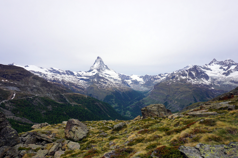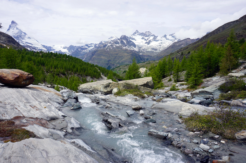 马特宏峰地区和伯尔尼高地的少女峰地区地貌景观差别非常大:少女峰地区草坡柔和、山峰奇秀;采尔马特Zermatt/马特宏峰Matterhorn 地区巉岩绝壁山石裸露,更荒凉苍劲。走在这大山皱褶里,才真正明白为什么几百年前瑞士男子去欧洲做雇佣兵,赞佩他们的坚韧,更为他们的无奈和有去无回难过,才真正明白“垂死的狮子”何以如此令人恸容!