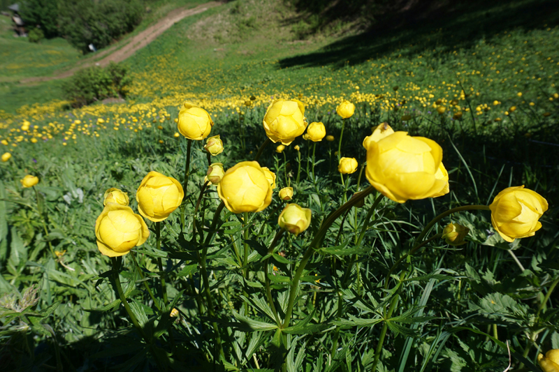 下山乘缆车到Furi后,可以乘缆车回Zermatt,也可步行。我们选择了步行。这里步道不少,路牌东西南北指示得分明。非常美的山间小路,远处是白雪皑皑的阿尔卑斯山,近处是绿草如茵的山坡,坡上大片大片开满了黄色野花。 野花长得十分精致,如迷你玫瑰,在微风中摇曳,山野显得格外生趣盎然。一路草地雪山,牛屋点点,典型的阿尔卑斯山脉景色。
