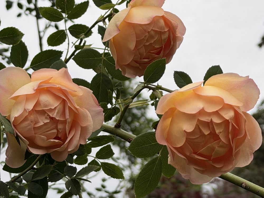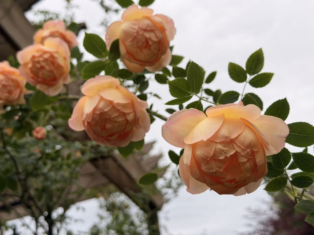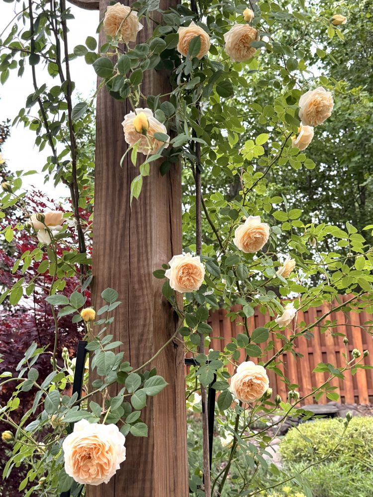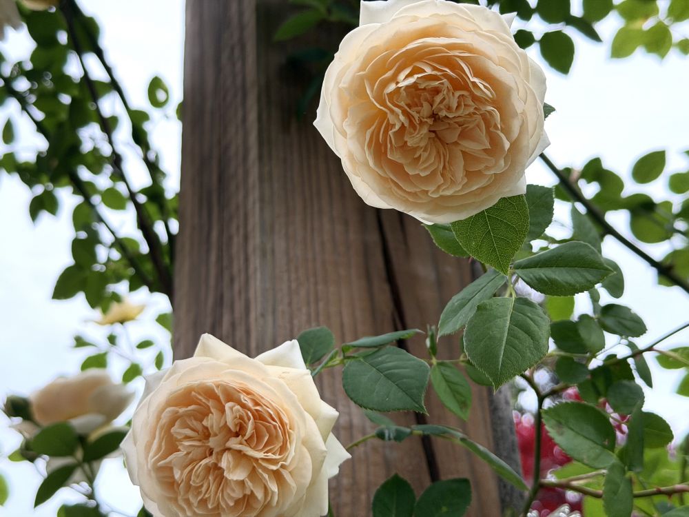 家里的两株爬藤玫瑰同时绽放了,这来自领导的精心养护: