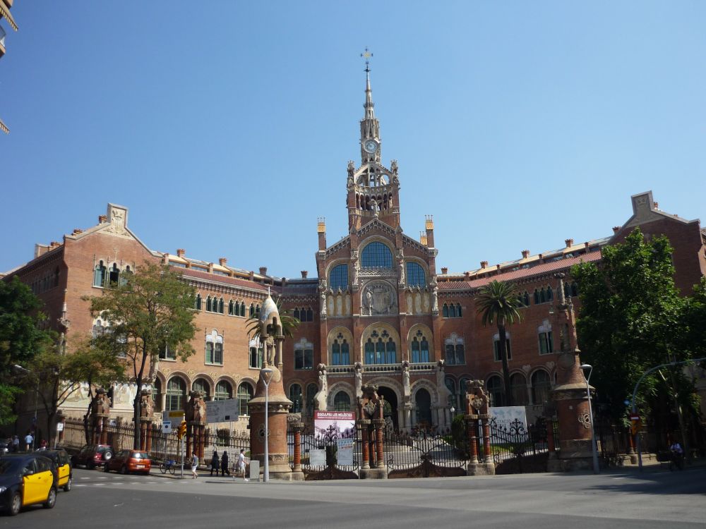 这里是那个有名的圣保罗医院,但是在整修,不开门,我们没进去。圣保罗医院是建筑师蒙达内尔父子的作品,1997年被列入世界文化遗产名录。这座规模宏大的医院由彩色马赛克装饰的小楼组成,48座病房在地下互相连接,建筑间点缀着花园和绿地,为病人创造了优雅的疗养环境。 入口建筑的顶部有一座尖塔,登上塔顶整座医院可以尽收眼底。建筑和庭院中以历史题材的马赛克拼图和保罗·加尔加略的雕塑作品装饰,内部的楼梯和天花板具有伊斯兰艺术风格。它作为医院直到2009年。目前设有艺术学校(Escola Massana)和加泰罗尼亚图书馆(Biblioteca de Catalunya)。