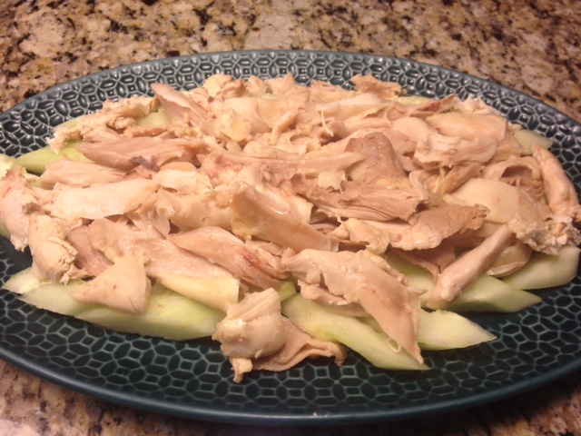 我不吃鸡皮,煮鸡前就把鸡皮扒了。煮好后就省了去骨的步骤,直接从骨头上卸肉,