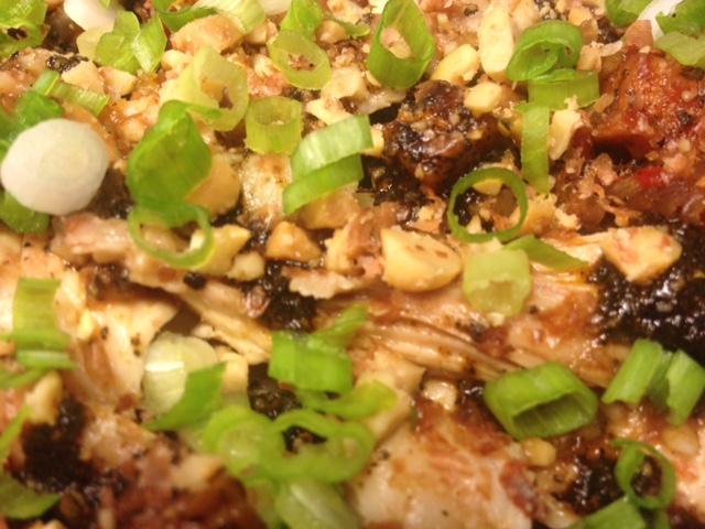 然后倒上料,撒上花生碎和葱花: