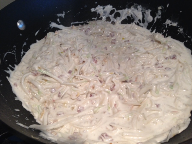 2杯粘米粉加一杯半水搅拌好,倒到炒好的萝卜丝里,再倒3/4炒好的肉料,继续炒到米粉有7分熟。
