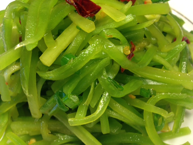 莴笋切丝,用盐腌半个小时,使其变软,滤去水分。剪一些地里的小葱,拿两个去年种的,晒干的辣椒,切小圈,撒在莴笋上,