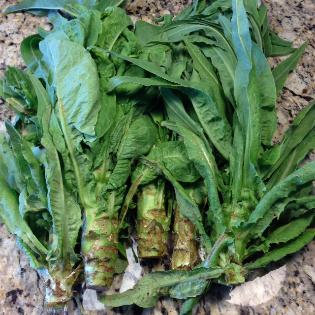 虽然菜园里的菜不多,还是有一些收获。去年秋种的莴笋到了收获的时候。这是一部分,