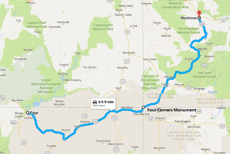 离开佩吉城就算踏上了归程,按我原先的计划是走犹他191路回到摩押(Moab)停一夜,再走70原路返回丹佛,但儿子建议我们走一条不同的路,通过四角落进入科州,在Montrose 停一夜,还可以看看黑峡谷,因此四角落和黑峡谷就成了意外的收获,还体验了美丽的科州,户外活动的天堂。
