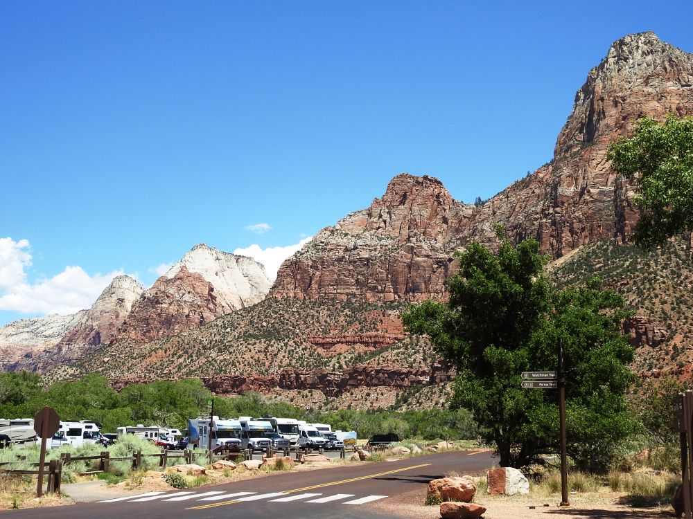 直到傍晚继续向西南80迈到山中旅游小城Springdale留宿,这里就在锡安国家公园边上,完全是借着公园发展起来的比较成熟的旅游城,城中有免费班车送游人到公园门口,免去开车停车的麻烦。第四天我们就坐公园的班车进入锡安国家公园(Zion National Park),爬山走徒步道欣赏美景。
