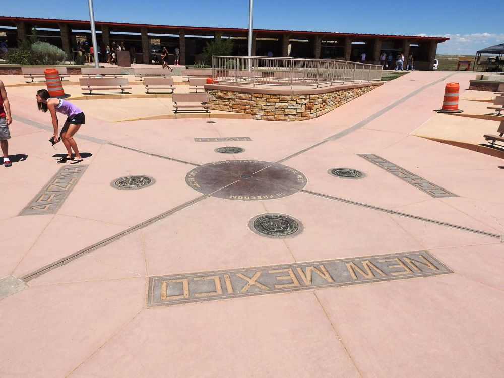 第六天离开佩吉转向东,沿着大漠开了约3小时,中午时分到了美国唯一的四州交界点四角落(Four Corners),由于它特殊的地理位置,吸引很多人来体验一下脚踩四州的乐趣,我们也在这特别的地方排队留影。